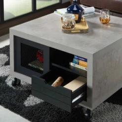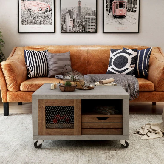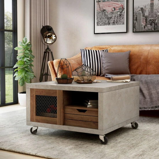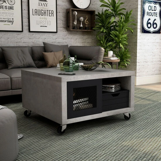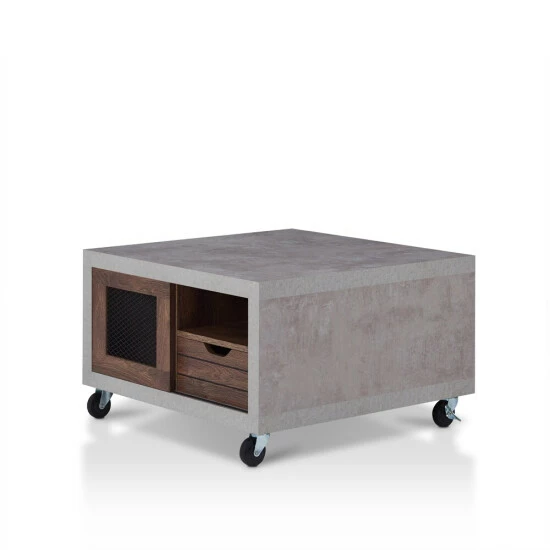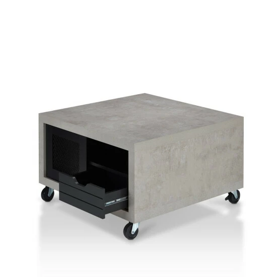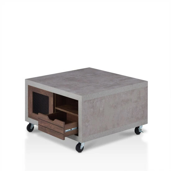 Feel the Industrial vibe with this Niaz Multi Storage Coffee Table. You can create a custom modern look in your living space with this two-tone, multi-storage coffee table. On each side of this piece from Furniture of America you will find an open shelf perfect for books and magazines, a plank style drawer front with cut out pulls for a rustic touch, and a closed cabinet with a mesh insert front to store other items. Available in multiple wood finishes, the cement look frame sits atop caster wheels for mobility and versatility, and will accent a diverse range of decor styles.