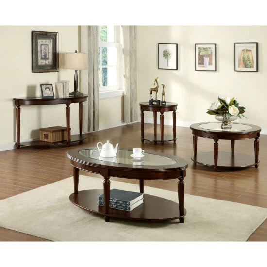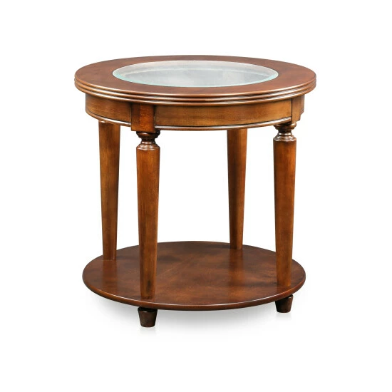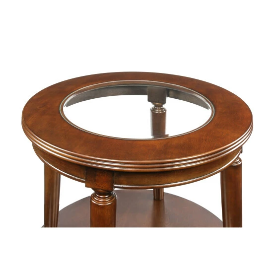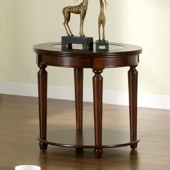 A beautiful piece to bring out the sophisticated style of your custom space, the Nill transitional cherry wood end table stands apart from the rest. This elegant table from Furniture of America reflects careful attention to detail, delivering a tasteful silhouette perfect for a living room or family entertaining area. Solid wood construction with wood veneer renders a solid, sturdy piece saturated with a gorgeous dark cherry finish to add a dramatic impact. Its round silhouette is especially enticing. Post legs with turned accents taper as they join a slender shelf perfect for displaying dรฉcor, as a thick beveled glass center insert refines a surface spacious enough for a lamp or artistic embellishments. This beautiful table raises the level of sophistication in any space.