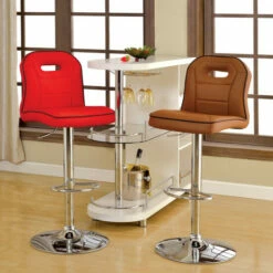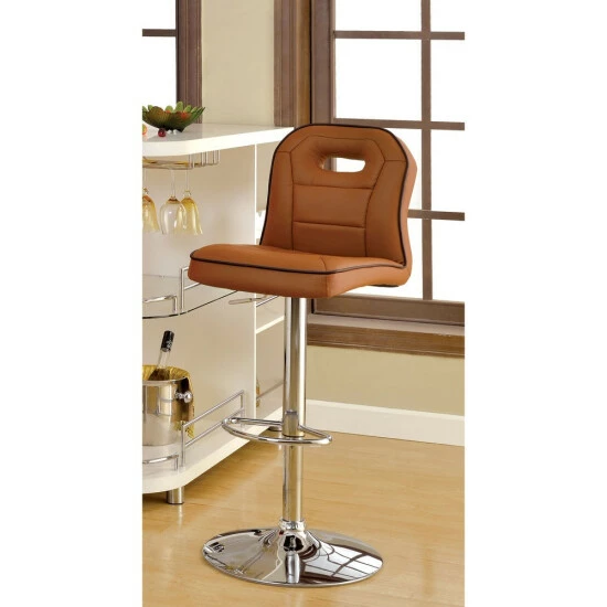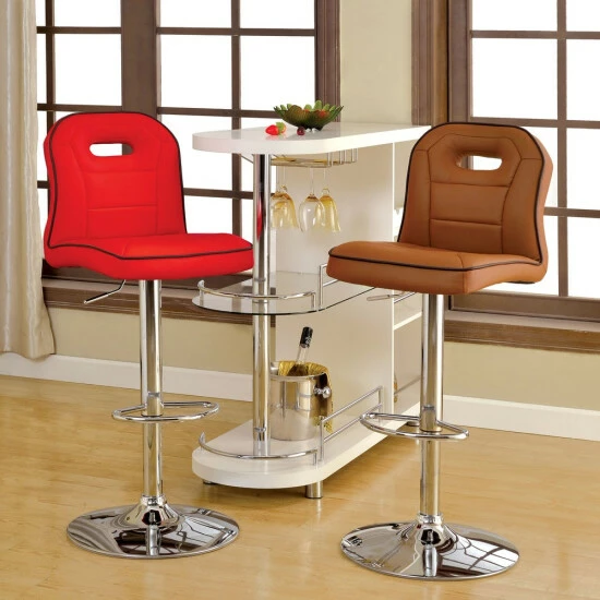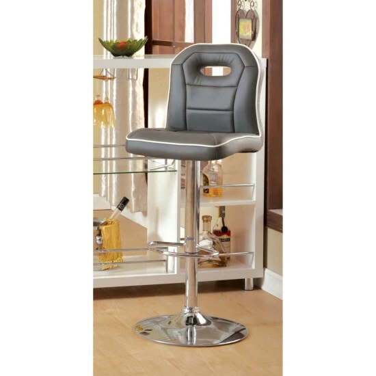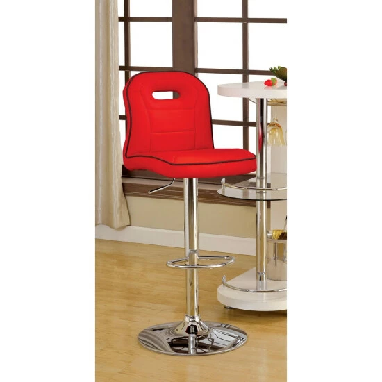 Stay on track with the charming racing motif that builds the design of a classic. The Nopp modern armless padded swivel bar stool from Furniture of America takes on an auto theme as it stylizes a relaxed modern kitchen or nook. A special design mimics a padded car seat with a generously padded unit filled with foam and wrapped in smooth faux leather. Its racer back style receives definition with contrasting and complementary welt edges, stitching, and an oval cutout back emblem. A brilliant chrome finish metal base unit resembles a barbershop theme, with a built-in ring footrest, pole support, and a round base. Adjustable height settings using a pneumatic gas lift tailor the seating experience, and a full 360-degree swivel feature adds comfort and convenience. Choose an upholstery finish to blend perfectly with surroundings.