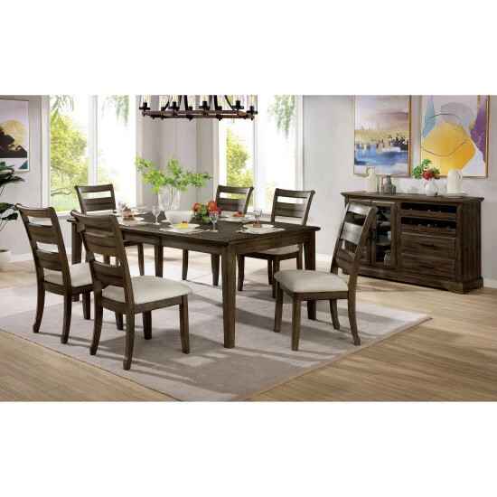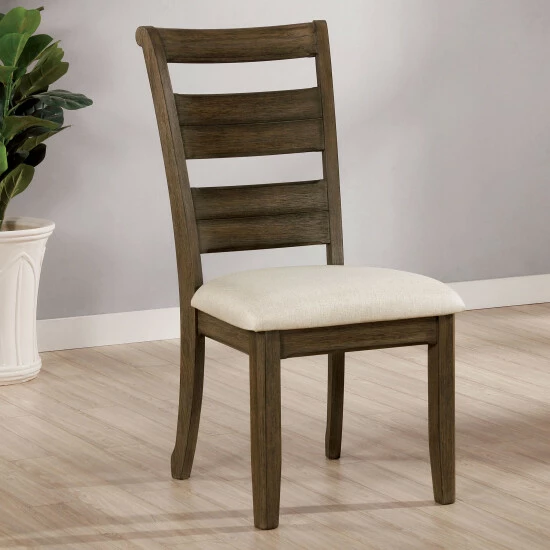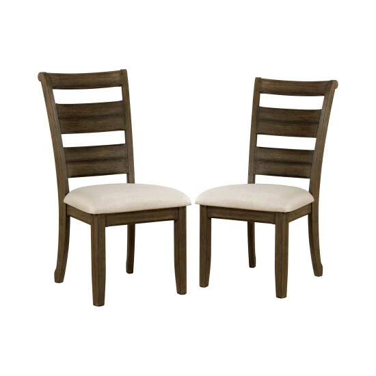 Transform your kitchen counter into a favorite spot for grabbing a bite or enjoying breakfast with this set of two Furniture of America Nydia side chairs. Boasting a ladder back design for casual charm, these side chairs have a wooden frame for hard-wearing appeal and longevity. The seats are upholstered in linen-like fabric and feature foam filling for a comfortable seating experience. Featuring footrests to support your feet and reduce pressure on your legs, these stools feature neutral beige cushioning with a light walnut finish, ensuring they work well with different color schemes. Make the easy choice of choosing these wood side chairs for your space.