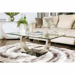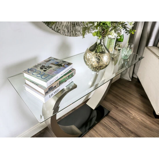 Modern designs have blended with elegance to produce this beautifully eccentric and eye-catching accent table set. Made by furniture of America for the outstanding Odora collection, the beveled and tempered glass tops sit steadily upon the base, beautifully contemporary in design and eager to catch your eye. Each piece flaunts an exquisitely attractive curved double pillar pedestals while offering ample room for drinks, snacks and decor. The base has a wonderful satin-plated finished that enhances its modern and contemporary style, all while working with transitional living room decor types. Made from metal and glass, this is a sound and sturdy set to complete your living space.