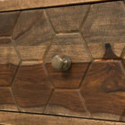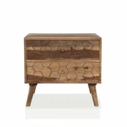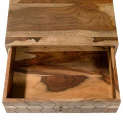 A stunning piece to feature in any home, this beautiful nightstand pulls double duty as decor and storage. The carved honeycomb drawer design brings visual dimension to the solid sheesham wood grain and natural finish. Angled legs add a hint of modern appeal, uplifting the rustic design to a bohemian vibe.