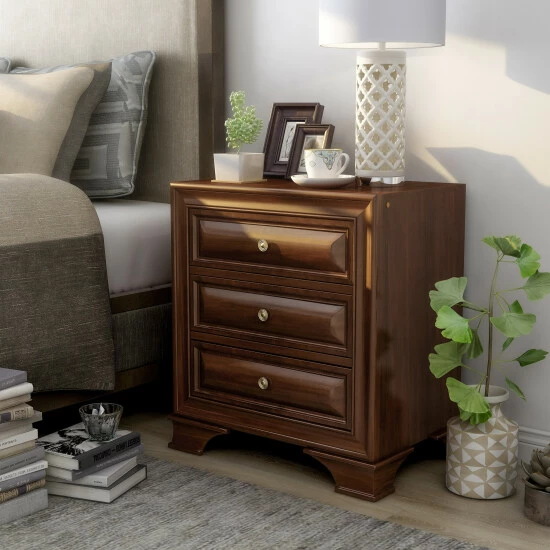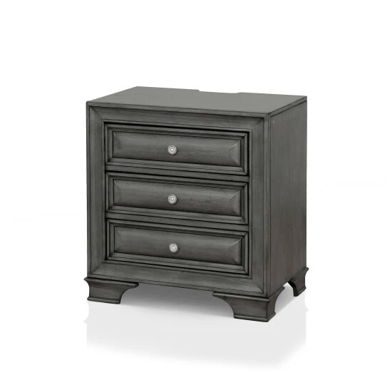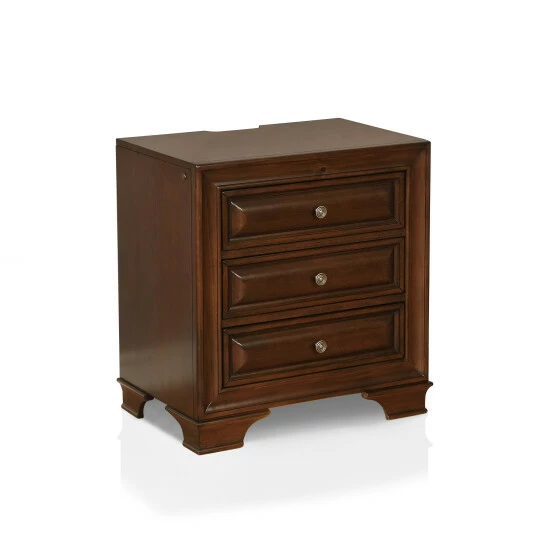 Boost storage space in your bedroom with this solid wood three-drawer nightstand from the Furniture of America Oslo collection, complete with a convenient built-in USB outlet for charging handheld devices. Each of the three spacious drawers provide ample room for apparel, offering an English dovetail and cedar construction that protects your belongings and keeps them lasting for many years. Fastened with antique-like drop pulls and attached to center metal glides, each drawer offers a smooth easy access. There is even a felt-lined top drawer for securing delicates. Available in both a brown cherry or antique grey finish, this traditional nightstand is the perfect addition to a modern farmhouse style master suite, lending a minimalistic style with classic molded trim.