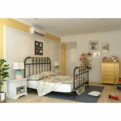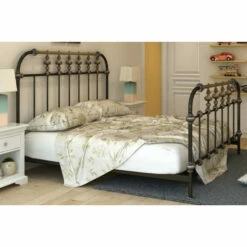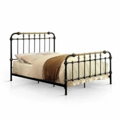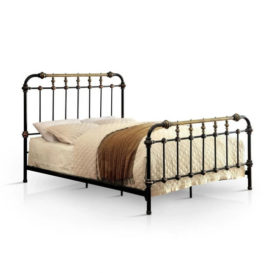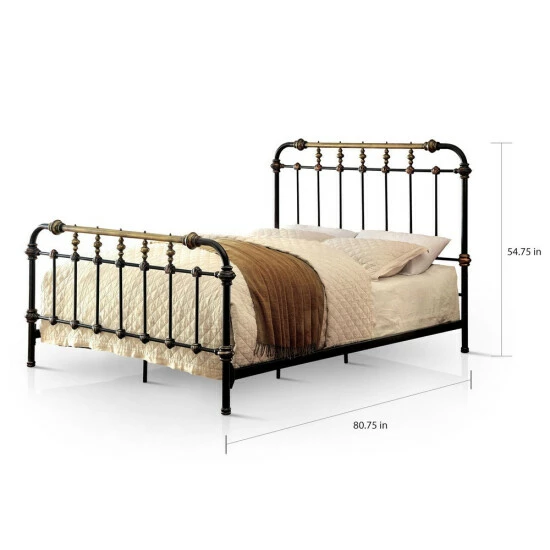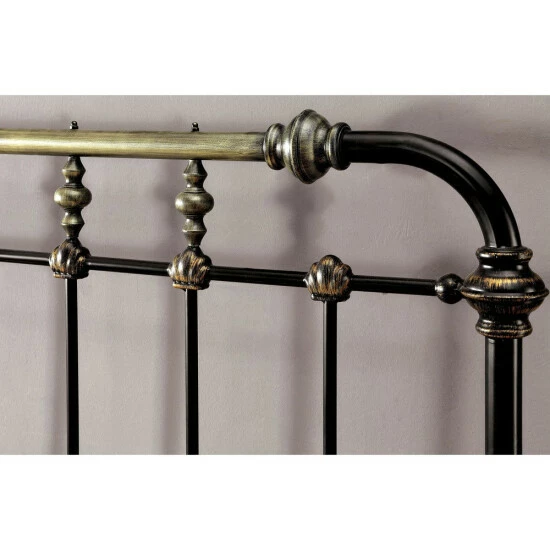 Update your bedroom with this contemporary metal spindle panel bed. This exquisite bed from Furniture of America mirrors the classic early 20th Century model with a romantic upgrade featuring dual finishes of black and antique gold. Parallel spindles recreate a familiar look, dressed up with rounded edges and ornate finials. Hand brushed antique gold accents deliver a true aged character to set the mood in a child’s or guest bedroom.