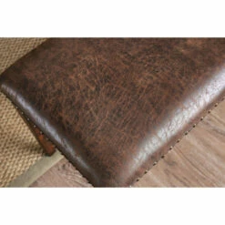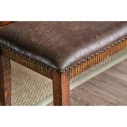 Lend some eye-catching panache and rustic flair to your dining space with this bold and alluring dining bench. Its beautiful, light walnut finish is highlighted with bold texture and rustic wood grain detailing. Tapered legs offer ample support while adding a bit of elegance to the simple silhouette. The rich leatherette seat is luxuriously smooth to the touch. The comfortable padding beneath the upholstery offers maximum comfort for your everyday dining enjoyment. Beautiful, silvery nailhead trim adds a pop of polish and pizzazz. Pair this bench with matching dining room pieces, sold separately, for a transitional touch that’s sure to enrich your decor in an instant.