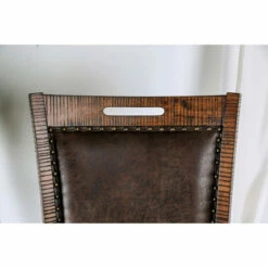 Transform your dining space into a showroom with the robust and resplendent design of this Venta Rustic Light Walnut 2-piece chair set. The rustic style is highlighted with classic elements like faux leather upholstery and a nailhead trim for a look that is positively regal. In light walnut finish with plenty of textural and distressed details, these handsome chairs create a classic dining room environment with a warm, inviting vibe. Add comfortable seating for two with a rugged look that includes wood grain accents and brown faux leather upholstery. Framed backs include handle cutouts and are complemented with nailhead trim and graceful straight, clean lines.