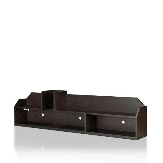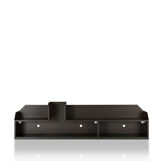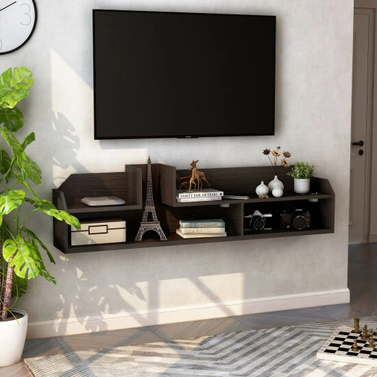 A Floating TV Console is a modern floor-space saving furnishing. This mountable console creates an expansive and clutter-free setting. It immediately opens up your space and gives it an airy feel. There are no concealed drawers or cabinets. and the top shelving is without a restrictive tabletop. This design allows for a unique lipped frame.Three wire holes on the bottom shelves make it easy to organize cables without hassle. With a total of four accessible shelves, you’ll discover the perfect decorating arrangement. So, keep your cable box, router, and modem among the company of your favorite decor items.Choose between two color options: walnut or chestnut brown. If you want an elegant and sophisticated entertainment center, walnut is the simple answer. However, if you desire something a little more modern and contemporary then enjoy the chestnut brown console. This offers walnut shelving framed by a trendy and warm chestnut brown.