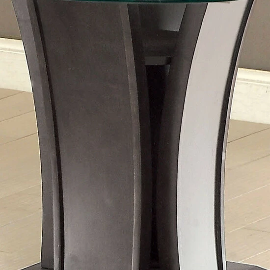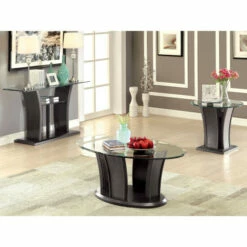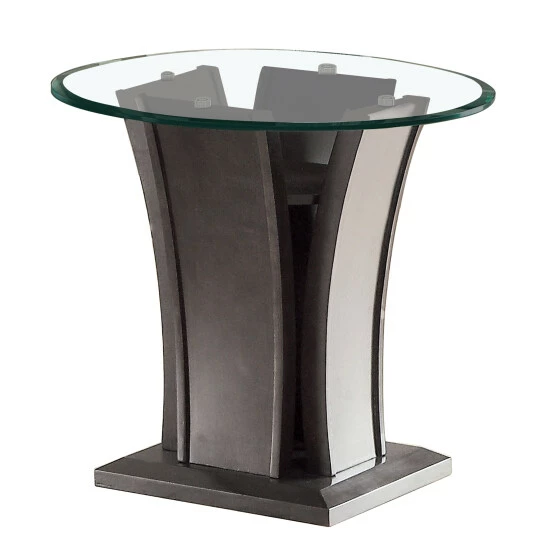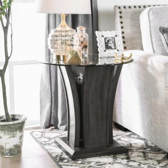 Make your mark in a design-forward transitional space with the Pecs gray wood and glass end table. This end table from Furniture of America is styled to impress and engage. Modern accents work with traditional features to build a lovely silhouette, offering an eye-catching look to embellish seating groups in living rooms and family rooms. Framework made from solid wood and veneer adds a sturdy look and feel, dressed up with a deep gray finish. Romantic curves on panel pieces with edge molding serve as both supports and flattering design statements, as an oval beveled glass top adds luster and radiance. Ample space for display makes this end table functional and fashionable.