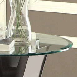 - Modern 10mm beveled glass top sits sturdily atop wood construction