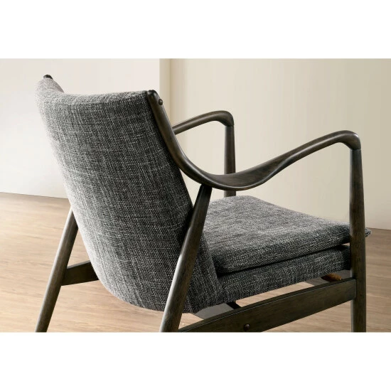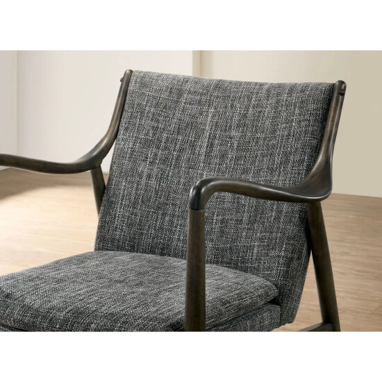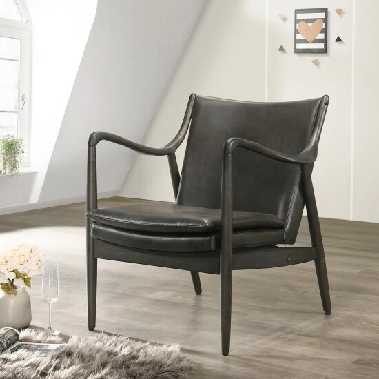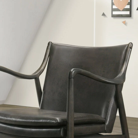 Crafted with unique style and charm, this chic accent chair puts a modern twist on mid-century styling. The chair features a solid wood frame with bold angles on the backswept legs and the swooped arms. The seat and back are padded and upholstered in your choice of faux linen or faux leather, the rich texture and color complementing the dark finish of the wooden frame for a standout look.