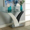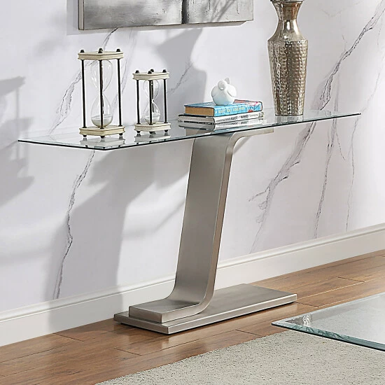 This modern sofa table from Furniture of America adds a sleek vibe to any home. It comes with a satin plated S-design frame and base that brightens the ambiance of any space. It’s crafted with a beveled tempered glass top, with plenty of room to display lamps, books, vases, and more. It has the sleek elegance, with a healthy dose of glam, to help transform any living space.