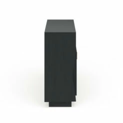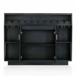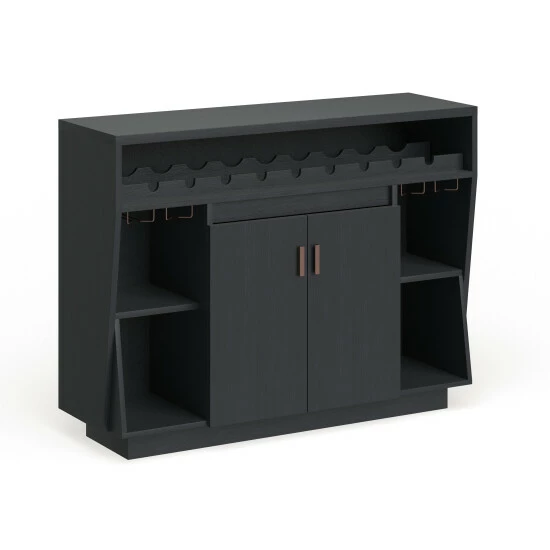 Store a multitude of kitchenware, wine bottles, and stemware in this black, contemporary style buffet. The rose gold hardware accents glow with warmth against a crisp and clean black finish that imparts modern flair. A center cabinet features two doors that open to reveal shelving to store serveware and larger items. On either side of the cabinet is open shelving that can be utilized.