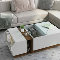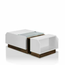 Inject a contemporary edge to your living room with this Podd coffee table from Furniture of America. This rectangular table exhibits a stunning modern aesthetic with its angular lines, glass top compartment, that conveniently lifts open, and two-tone white-and-oak color scheme. Stash books neatly on the two open side shelves and highlight decorative accents atop the smooth rectangular surface. This modern and contemporary coffee table is constructed from wood and MDF for lasting durability and style. Sitting upon a supportive platform base, this is an ideal modern or contemporary coffee table to add new life and style to your living space.