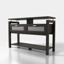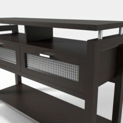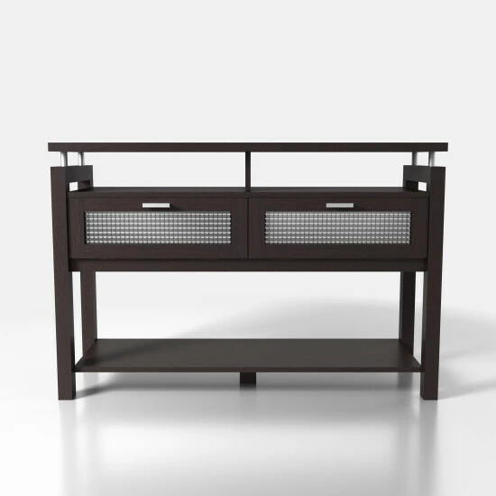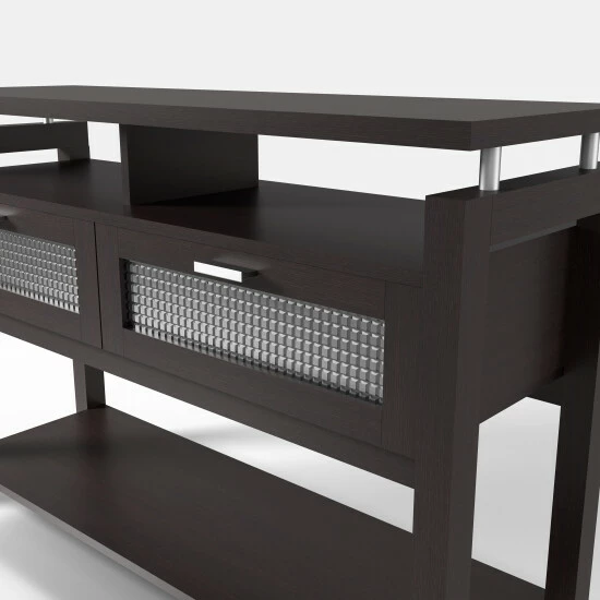 This gorgeous console table is the perfect way to showcase your vogue home decor style. The drop-down cabinets with stunning silver bar pulls feature attractive textured acrylic windows. Two open shelves beneath the top and a wide open shelf on the bottom give you plenty of space for displaying decorative items.