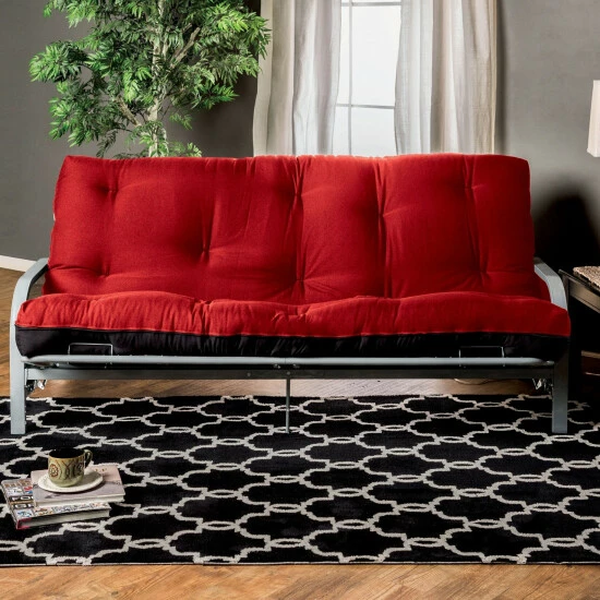 The Pram Contemporary Fabric Futon Mattress with Innerspring brings comfort home. Update and refresh your futon frame with this luxurious foundation by Furniture of America. With a choice of red or black fabric, you can bring a pop of color and style to a range of different interior decors. Featuring a soothing cotton and polyester blend fabric, the futon mattress offers soft tufted accents and six inches of comforting foam filled cushion that will fit most futons. With innersprings for ample support, you can be assured that your guests will enjoy a good night’s sleep or a cozy spot to curl up.
