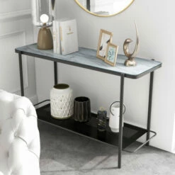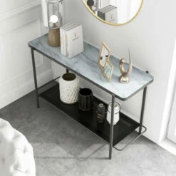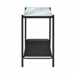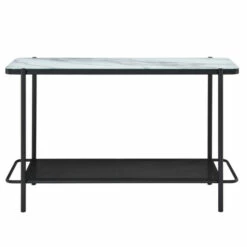 Blending style motifs to create a truly engaging design, this contemporary black finish console table is a splendid centerpiece. A glass top looks like white marble while a lower shelf is perforated for a lightened look that still provides plenty of storage.
