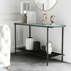 Blending style motifs to create a truly engaging design, this contemporary black finish console table is a splendid centerpiece. A glass top looks like white marble while a lower shelf is perforated for a lightened look that still provides plenty of storage.