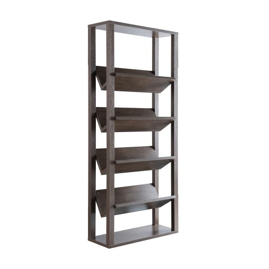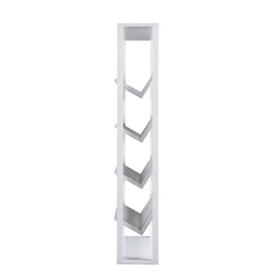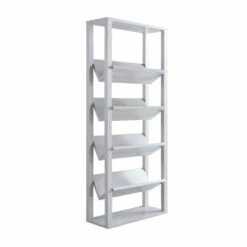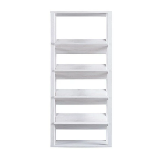 Enhance your contemporary decor with this five-shelf Puno bookcase crafted by Furniture of America. This is a stunning and rustic book case that creates an aesthetic flair in your living area that you won’t soon forget. Four appealing slanted shelves hold books securely in place, while flat top and bottom shelves provide places to display your treasures. This bookcase is supported on a solid rectangular base for stability and support. Constructed of sturdy MDF and other durable materials, this bookcase is available in white or walnut finishes to blend perfectly into your decor. Bring this bookcase into contemporary, modern, or rustic living areas.