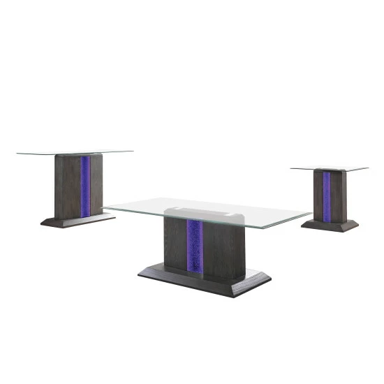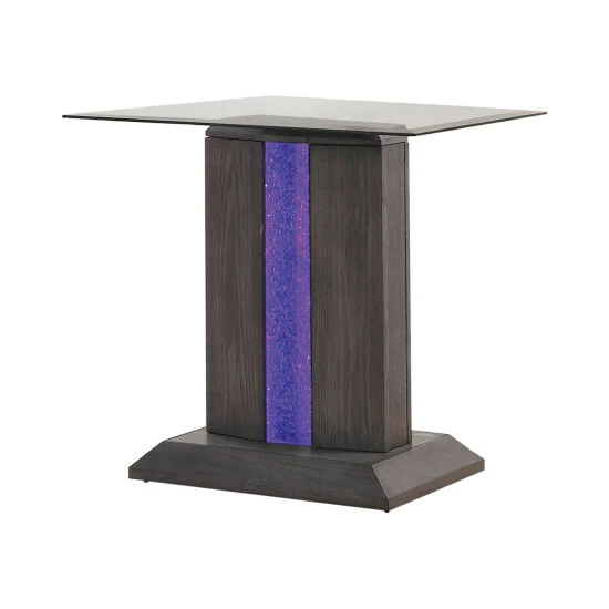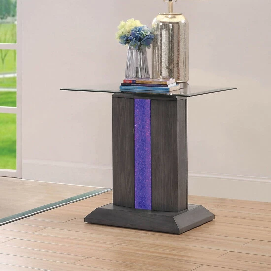 Dedicate a modern space to full functionality and hi-tech dynamics. The Quab contemporary glass top end table reflects a tastefully simple silhouette with clean lines and slight angles. With a sleek grey finish over solid wood and veneer construction, it offers a tempting palette compatible with today’s styles. A pedestal design renders this end table classic and contemporary. Embrace a must-have feature with glee, as a vertical center panel of tempered glass features embedded blue three-way LED lighting that provokes atmospheric elegance. This end table is topped with a slice of beveled clear tempered glass, making a cohesive list of materials come together.