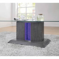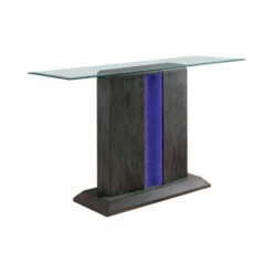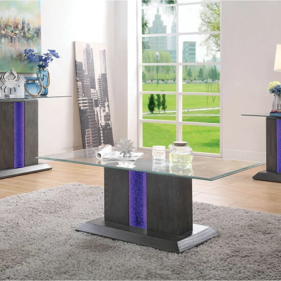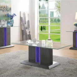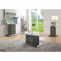 The Quab contemporary three-piece accent table set reflects a tasteful silhouette with clean lines and slight angles. With a sleek gray finish, it offers a tempting palette compatible with today’s styles. A pedestal design renders each table classic and contemporary. Vertical center panels of tempered glass feature embedded blue three-way LED lighting that provokes atmospheric elegance. Each table is topped with a slice of beveled clear tempered glass.