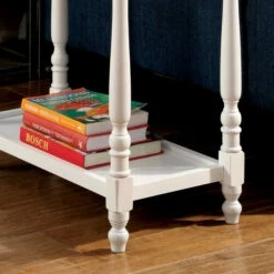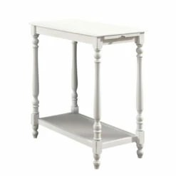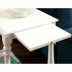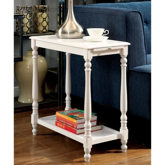 Accentuate your interior design scheme with the Quam white finish end table from Furniture of America. Enjoy its sleek, slender build with timeless turned leg designs that offer romantic shaping. Built from solid wood and veneers, it receives a fresh coat of white finish paint that invokes cottage charm. Place this adorable table chairside or next to a sofa, and use its convenient hidden pull-out top tray for serving space. A rectangular top and tray-style bottom shelf free up more space for displaying lamps, books, and décor. This traditional table works in a variety of settings, adding a fresh look with old fashioned charm to a living space or bedroom.