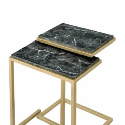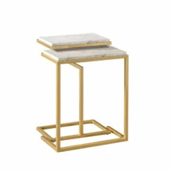 Classy and convenient all at once, this set of two nesting tables adds a glamorous accent to a living room lounge space. Each table flaunts a crisp silhouette with an elegant metal base and faux marble top. Light and compact, they can be moved easily from place to place to add surface space wherever needed. These sleek, contemporary tables stack neatly together when not in use for a convenient space-saving solution.