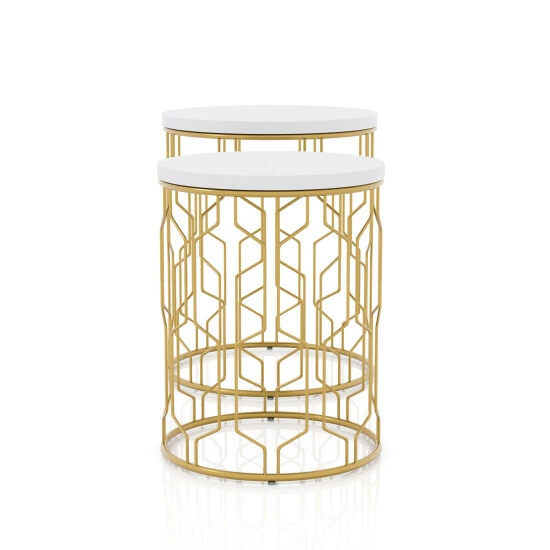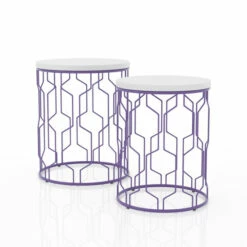 Add a vibrant splash of color with this gorgeous industrial nesting table set, available in your choice of three gorgeous finishes. Smooth, round tabletops over sleek, geometric bases create a striking design that’s sure to draw the eye. Place them throughout a living room for two handy snack surfaces and stack them together when not in use for space-saving convenience.