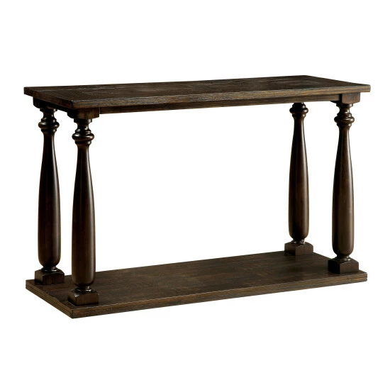 Pair this sofa table with your favorite living room furnishings to provide a convenient resting spot for drinks, decorative display items, and more. The dark walnut finish matches darker color palettes or other neutral-tone furnishings. Expert craftsmanship, using plank-style panels, gives it a touch of rustic charm that adds loads of personality to add to your living room decor. Graceful, turned legs amplify the handsome design with just the right amount of classic elegance to bring its design to life. Complete with a lower storage shelf for books, games, and other essentials, this transitional sofa table has everything you need for a stylish living room gathering space.