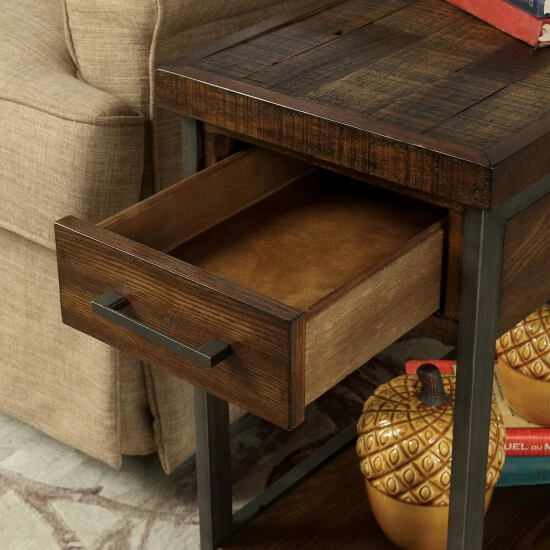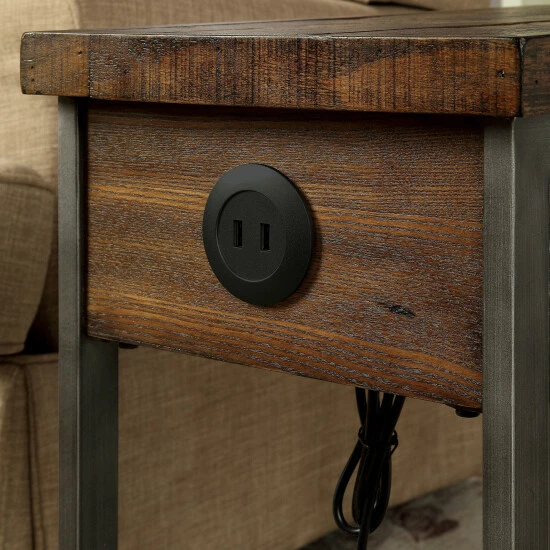 Rustic styling and modern convenience combine in this chic and functional side table. The table features a plank-style solid wood top and lower shelf with rustic oak finish veneers, supported by a metal framework. A single drawer offers space for your remotes or important accessories, and two USB outlets built into the back allow you to easily charge your devices.