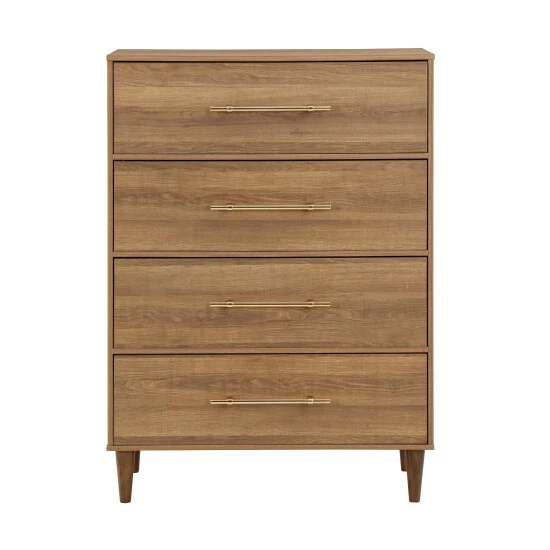 Add storage and impeccable style with this contemporary four-drawer tall dresser. Perfect for clothing, linens, and accessories, the dresser offers a light oak wood finish paired with tapered legs and gold-coated bar handles for a chic, elevated finishing touch.