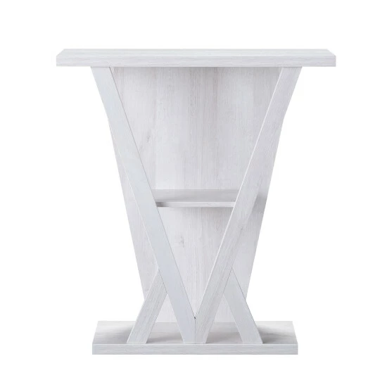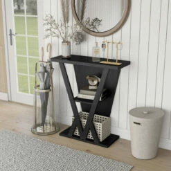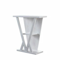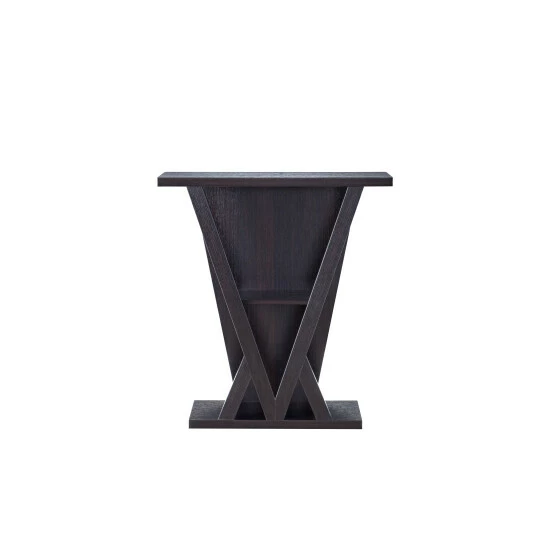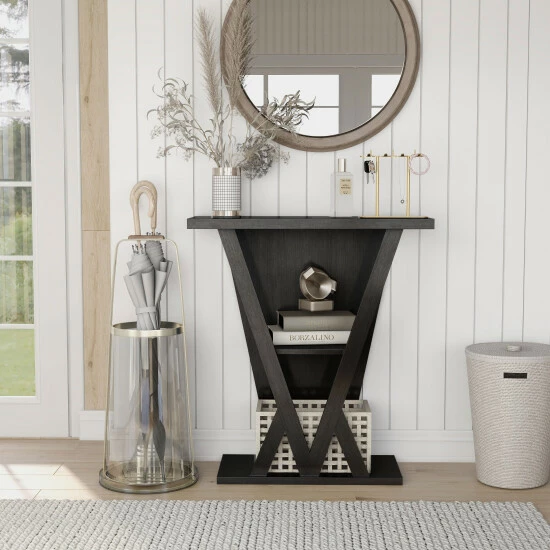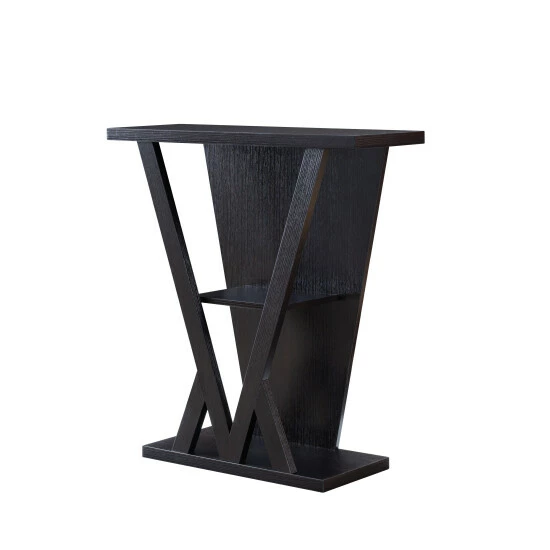 Slip this narrow console table into a small entryway or living room for extra display space. Beautifully crafted from Furniture of America, the crisp, contemporary V-shaped design immediately draws the eye to this immaculate piece. Its compact design ensures a minimal footprint in your living room while still making a statement in your space. With this transitional style console table, You’ll find a smaller lower shelf provides space to display books, flowers, and other decorations. This piece is crafted from a mix of materials that make it a durable and quality solution for a console table in your entryway and living area.