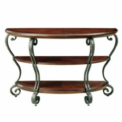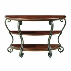 Rich cherry finish wood starts the decadent design of this industrial-inspired console/sofa table from Furniture of America. The Raiz traditional sofa table plays with romantic, alluring curves to capture attention. A bit of farmhouse charm sneaks in to brand a vintage, cottage feel. Dual layers of wood create a visually pleasing stacked look. Scrolled metal leg supports with ornate engraved detailing anchor to spacious center and bottom shelves, providing extra room for display and storage. This table offers an inspiring nod to traditional furnishings and blends beautifully with a variety of room designs and seating ensembles, adding a rich aesthetic.