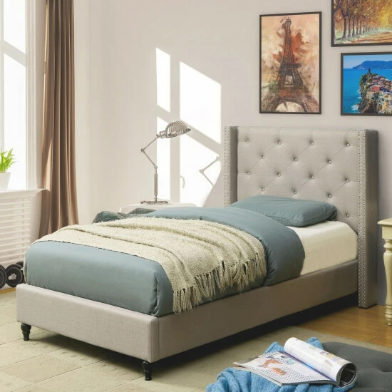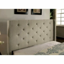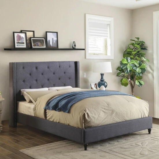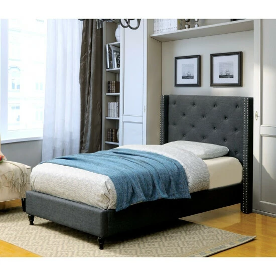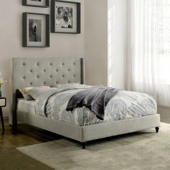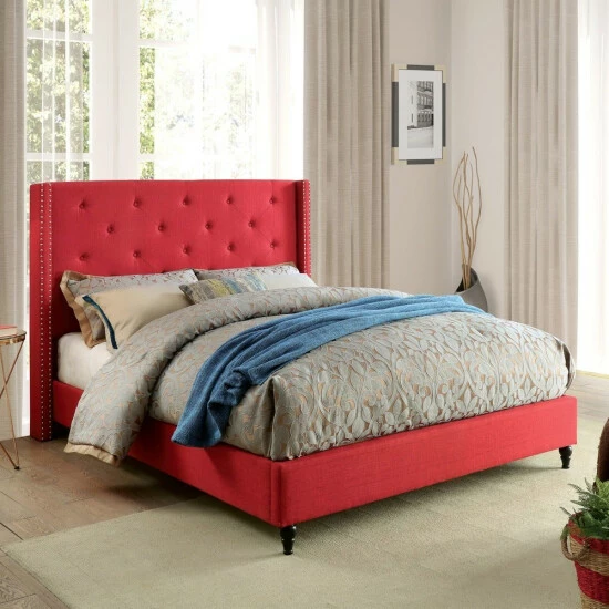 Turned legs and button tufting provide a sophisticated base for a sleek contemporary bed. Made by Furniture of America for the Ralen collection, this bed is available in multiple colors to create a truly custom design in your sleeping quarters. Bold and beautiful, the platform bed features a wingback headboard with chic style. It boasts button tufting for an incredibly contemporary feel, while a double row of nail head trim enhances its style. With a solid wood frame wrapped in linen-like fabric, this is an essential and elegant upgrade to your bedroom. Bring it into your bedroom for a subtle hint of glam.