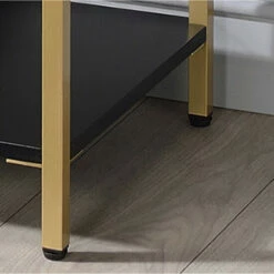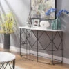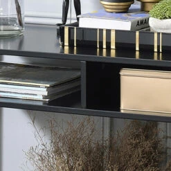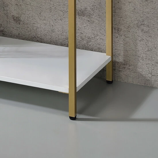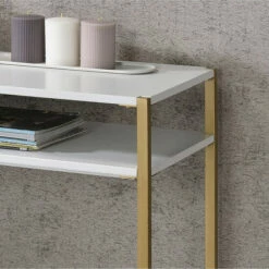 This glam console table makes a fabulous appearance in any room. The gold coated steel frame is a sturdy construction with a slender posture. Its open design offers a tabletop, lower shelf, and divided central shelves for a sleek look.