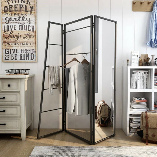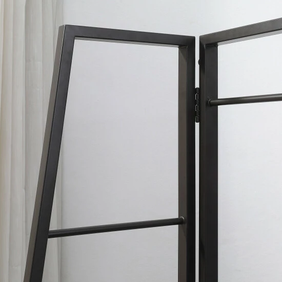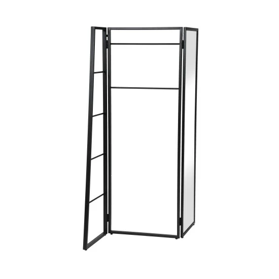 Complement your modern space with the function and style of this contemporary coat stand. A versatile design that works in a plethora of spaces, this rack boasts a three-panel, tri-fold design and includes a full length mirror. A multitude of horizontal hanging bars host everything from tomorrow’s outfit to coats and accessories. A rich powder coated frame is built in steel for optimal strength and durability.
