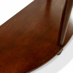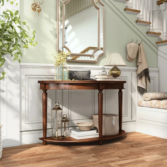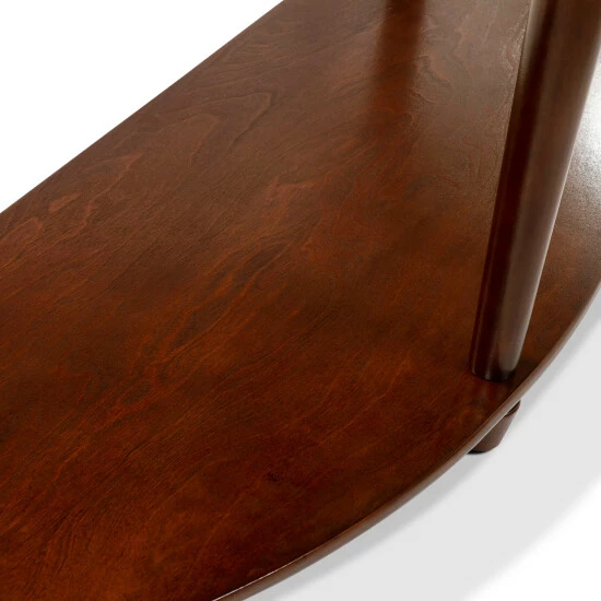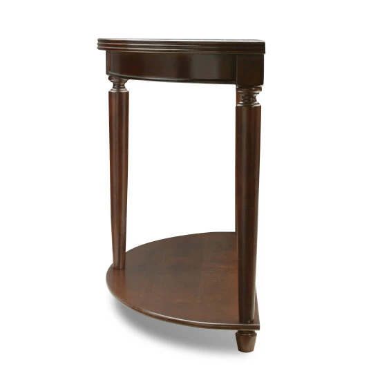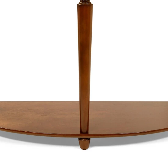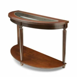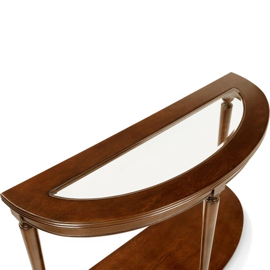 The ideal anchor for your personal safe haven, this half-round, transitional cherry wood sofa table stands apart from the rest. Its solid wood construction, with wood veneers, renders a solid, sturdy piece saturated with a gorgeous dark cherry finish, while post legs with turned accents taper as they join a slender shelf, and a thick, beveled glass center insert offers spacious display.