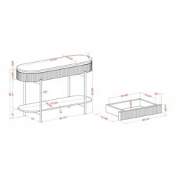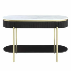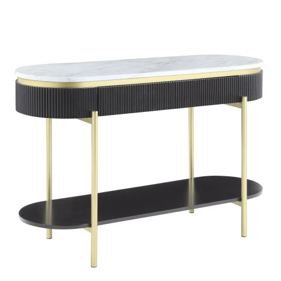 Set interior design trends with this mixed-material oval sofa table. Chic details meet a mid-century modern scheme for vogue home decor. The rounded-off plane of the body presents a ridged pattern that conceals a useful drawer. A faux white marble tabletop is accented by a gold trim while the chest is arranged within gold legs.