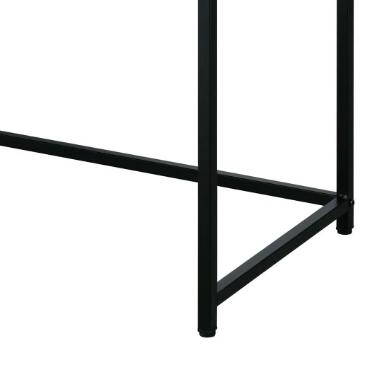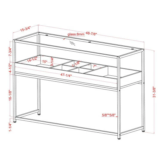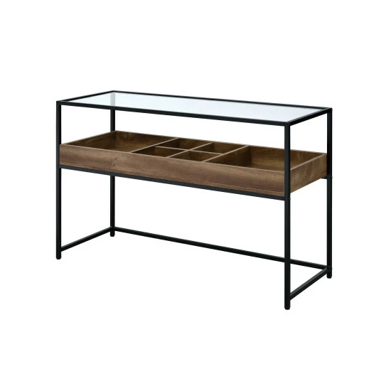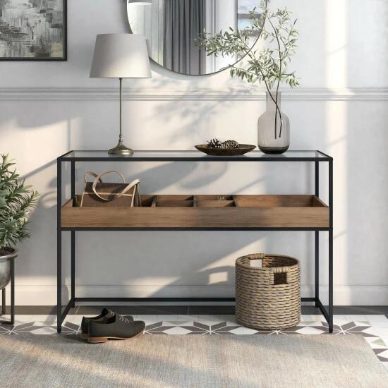 Keep organization in the home from the moment you walk in through your front door. This entryway table is the perfect complement to the space as it has a six compartment brown wood tray conveniently available for keys, wallets, and mail. The glass-top console table brings together this warm wood tone on a matte black frame for that urban feel.