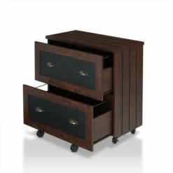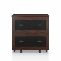 Merge industrial-vintage style and functionality with this charming farmhouse two-drawer file cabinet. Easily arrange and securely store your documents and folders in two spacious stacked drawers. It’s the details that amplify the rustic vibe of your workspace. The file cabinet features plank-inspired panels in a dark, rich wood finish that lend sophistication to an industrial inspired space. The cabinet is further enhanced with brass cup handles and chalkboard doors that allow you to label your drawers for easy access to just what you need, when you need it. Caster wheels underneath make it easy to move this mobile cabinet from one side of the office to the other, or from room to room.