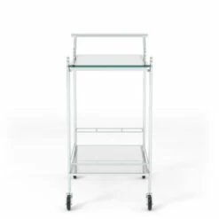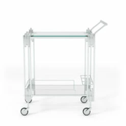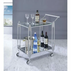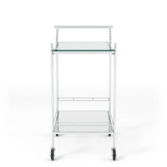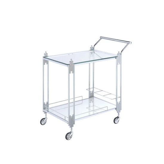 Take interior design to the next level when choosing elements for a modern space destined to become a central spot for entertaining. The Rimm contemporary metal serving cart delivers a suitable level of glam with just enough temperament to play nicely with surrounding pieces. For a contemporary or transitional room, this cart from Furniture of America dazzles with an Art Deco inspired configuration featuring staggered pipe design accents. Made from chrome finish metal, its rectangular frame plays a no-nonsense role in making space for beverages and stemware on two surfaces. A built-in wine rack secures favorite vintages in place, as a tempered glass top shelf and mirrored bottom shelf embellish its luxurious, sparkling personality, and caster wheels create easy movement from room to room and guest to guest.