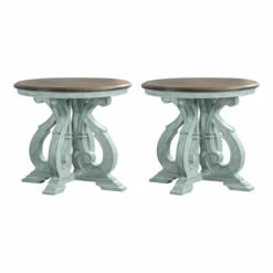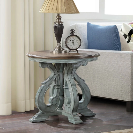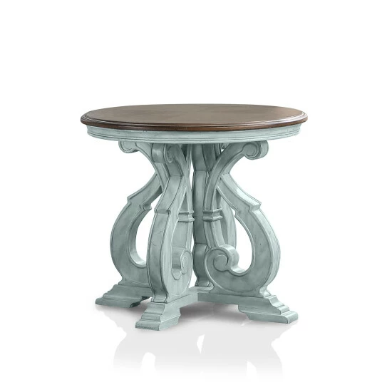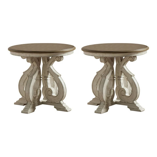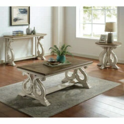 Dress up a space with this exquisite table set that features opulent scrolled base designs with stacked legs. Distressing over its light finish creates a sense of both character and authenticity. Embrace a two-tone finish that changes things up in all the right ways.