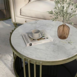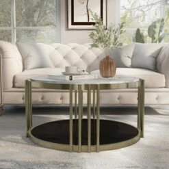 Art deco style sets the stage on this drum coffee table. The antique brass-plated frame features bar accents that uphold an elegant white faux marble tabletop shadowed by a black printed glass lower shelf.