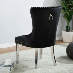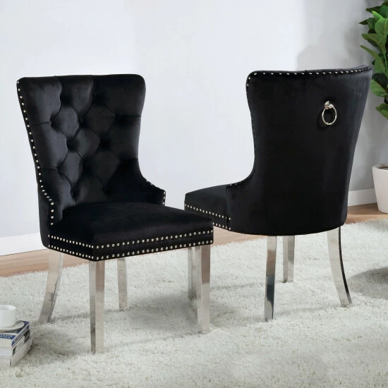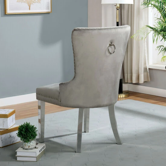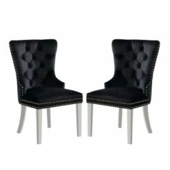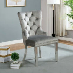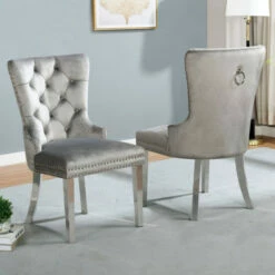 Instantly up the glam factor at your dinner table with this set of two transitional dining chairs with formal flair. Each features soft, inviting fabric wrapped around a slight barrel back and smooth seat. Chrome legs and nailhead trim glisten in the light and button tufting adds a classic touch to a contemporary glam aesthetic.