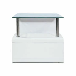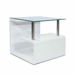 The Rost contemporary white metal end table from Furniture America has a style all its own. Fulfilling a wish list of modern interior designers, this sleek, energetic end table becomes a central focus in any updated custom living room or family room. Embrace a modular, asymmetrical look with a curved base made from MDF and given a high-gloss, lacquered white finish that radiates around any space. Round chrome finish metal supports offer connections and aesthetics, supporting a rectangular sheet of clear tempered glass that serves as a spacious top. This nouveau-style end table is an expressive element to boost the contemporary design creds of an updated casual or semi-formal space.