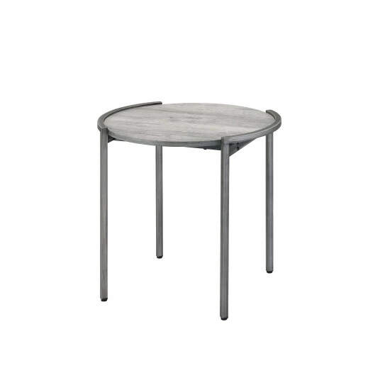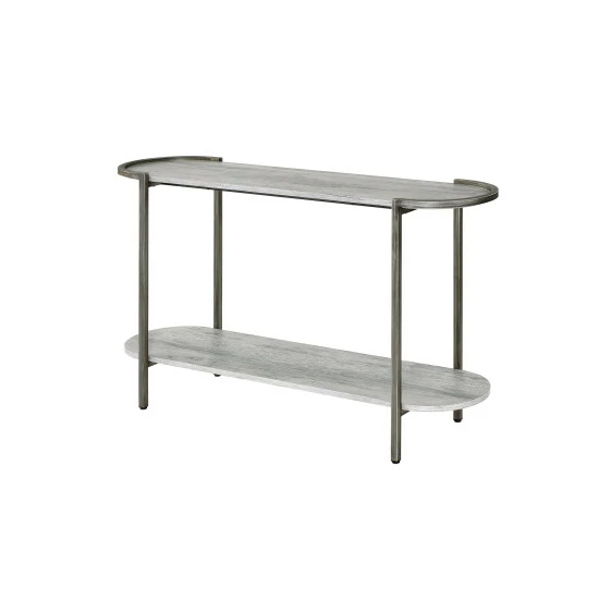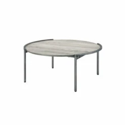 Framed within the brushed gun metal legs are round light grey surfaces. The slender legs connect to one another on the edge of the tabletop as is if to bracket the sides. This uniquely designed set includes a coffee table, side table, and sofa table.