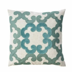 A scrolling trellis pattern is the focus of this beautiful accent pillow. Aqua and jade on beige canvas are perfect for a calm and relaxing bedroom or living room.