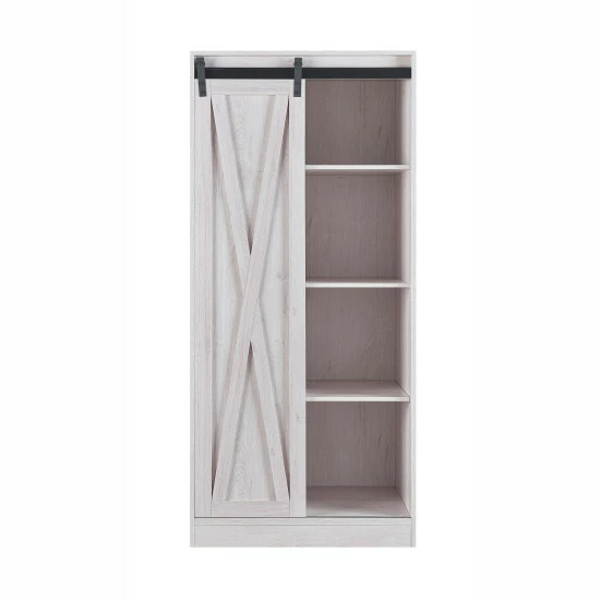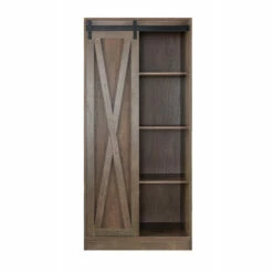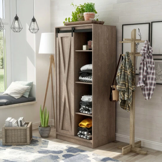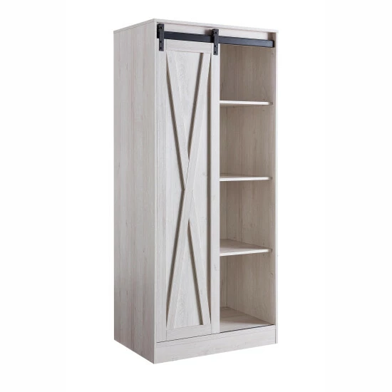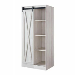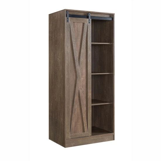 Expand your clothing storage with the rustic Rylie armoire from Furniture of America. The wood and veneer frame features a sliding barn door that can conceal the inner shelving and hanging rod. Choose from two finishes to complement your existing furniture.