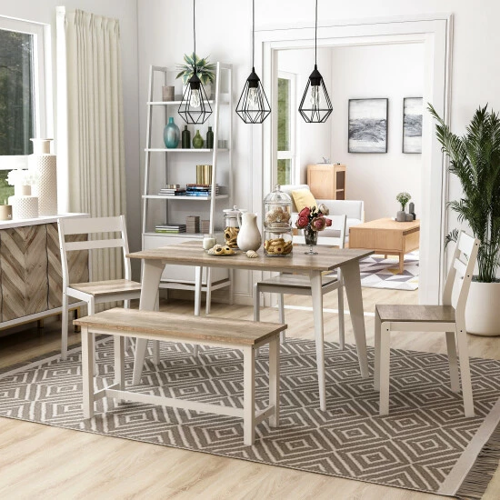 - Includes 1 dining bench, 3 dining chairs, 1 dining table