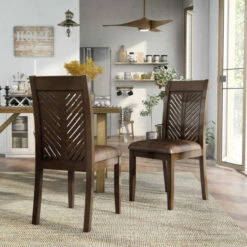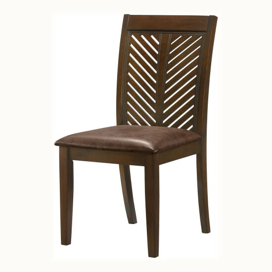 Take a bit of the natural countryside into your home with this set of two side chairs from the San Gabriel collection. Featuring a fabric-like vinyl seat, the tactile experience of these chairs is ideal for an afternoon meal. Chevron pattern tops give the chairs a refreshing, airy sense of presence. Transitional style makes them an improvement on most decor arrangements.