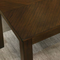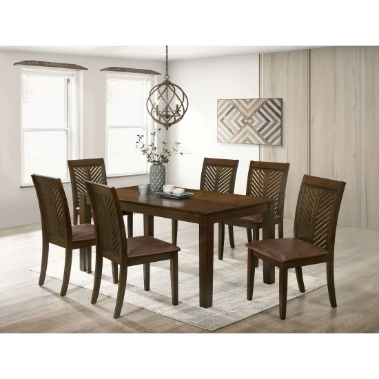 Take a bit of the natural countryside into your home with this seven-piece dining set from the San Gabriel collection. Featuring a fabric-like vinyl seat, the tactile experience of the chairs is ideal for an afternoon meal at the rich oak-styled table. Chevron pattern tops give the chairs a refreshing, airy sense of presence. Transitional style makes them an improvement on most decor arrangements.